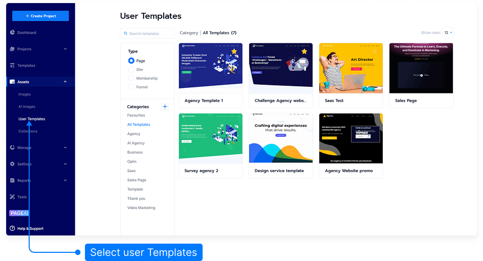 Return to your main dashboard. Click Assets menu and select User Templates.You’ll now see a list of all your saved templates. Your newly created template will appear here.