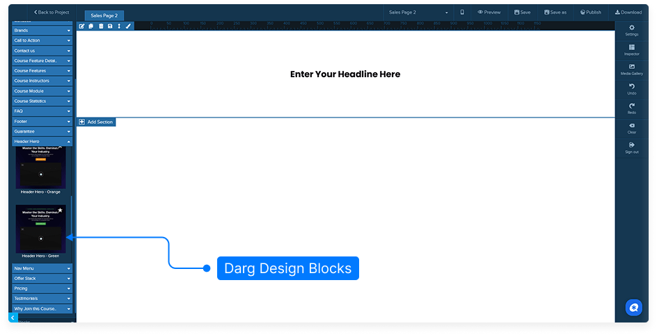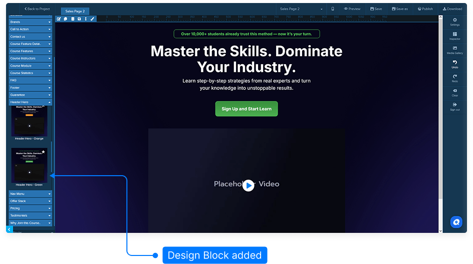 Adding a design block lets you quickly build out sections of your page using pre-designed layouts. These blocks save time and give you ready-made options for common elements like headers, buttons, and calls to action.