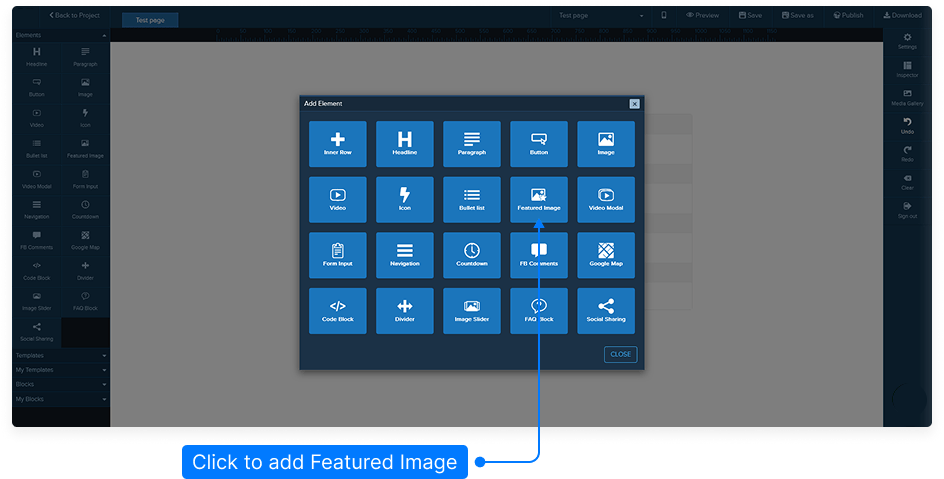 • Hover over the element above where you want to place the featured image, click Add Element, and select Featured Image from the list.