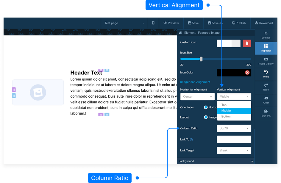 • Optionally, replace the image with an icon and choose the icon color and alignment (left, center, right, top, middle, bottom).
